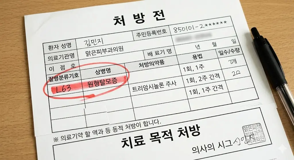 - 필수 질병코드: L63 (원형탈모증) 코드를 확인하세요.